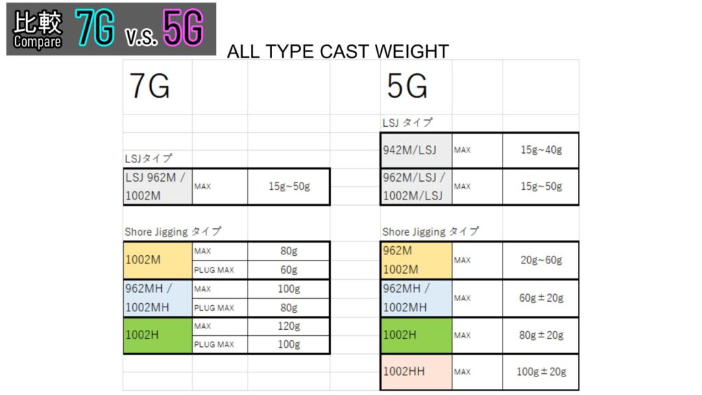 • ガイド設定: 7Gはバット側にステンレス製のMNガイドを逆付けし、それ以外はチタンガイドをメインに採用しています。一方、5Gはステンレスガイドがメインとなっており、7Gの方がより軽量かつ高価な素材を随所に使っています。
