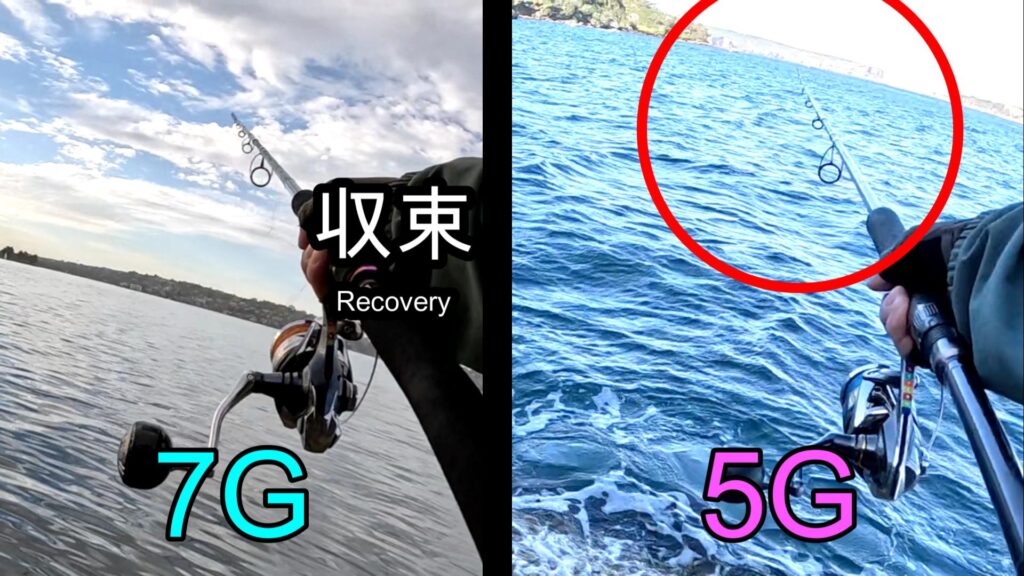 この差の要因は、7Gに採用された東レの最新素材**「T1100G」と「M40X」にあります。キャスト後の竿先のブレがピシッとすぐに収まる【竿の収束が早い】ため、エネルギーロスが少なく、飛距離が伸びやすい設計になっています。